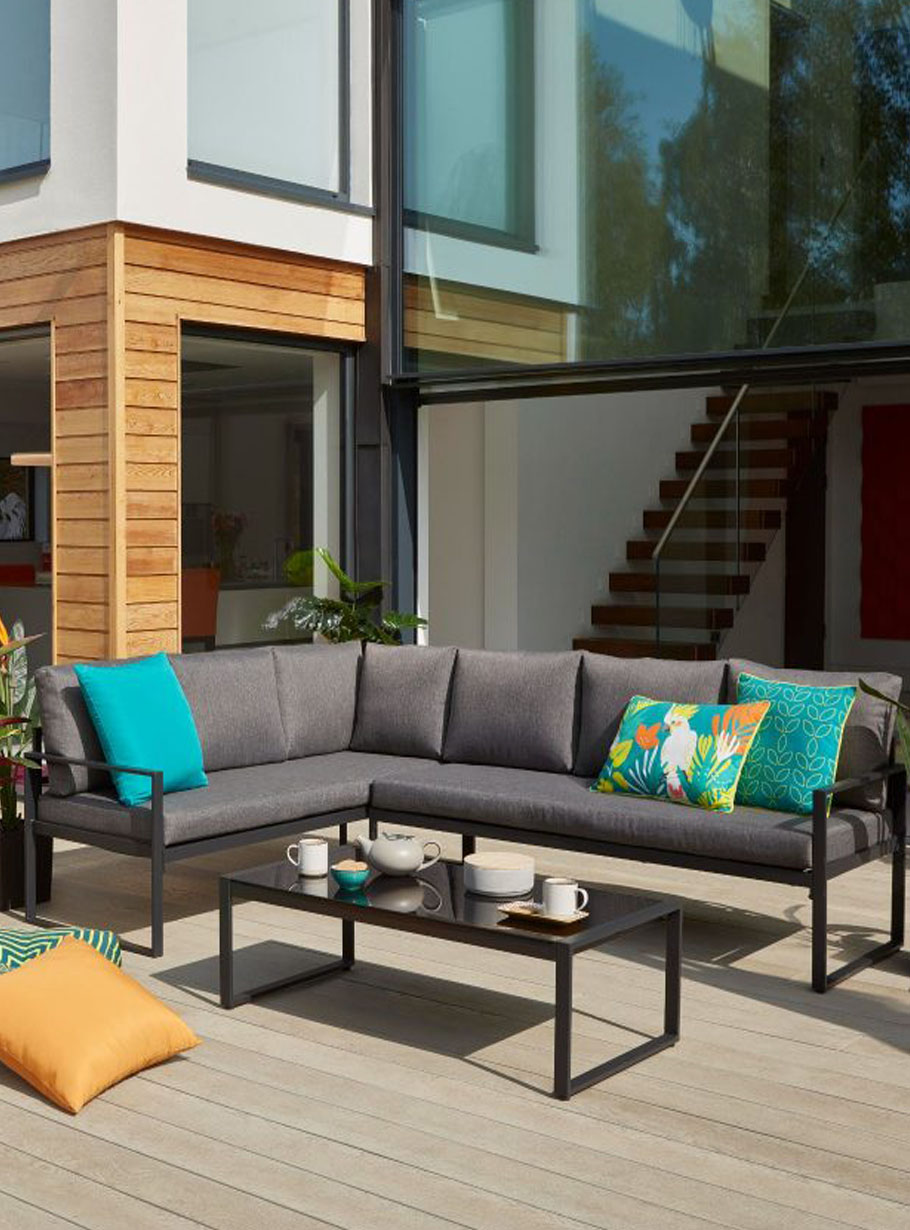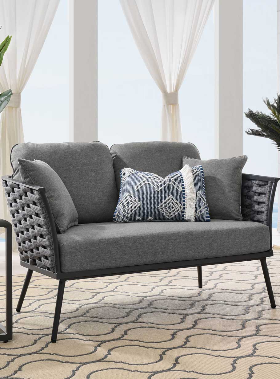 Enhance the style of your outdoor entertainment area with the this set. Perfect for a comfortable chat or casual drinks. The cushions are made with weather-resistant 100% polyester fabric with the beautiful grey seat color and modern red cushions.